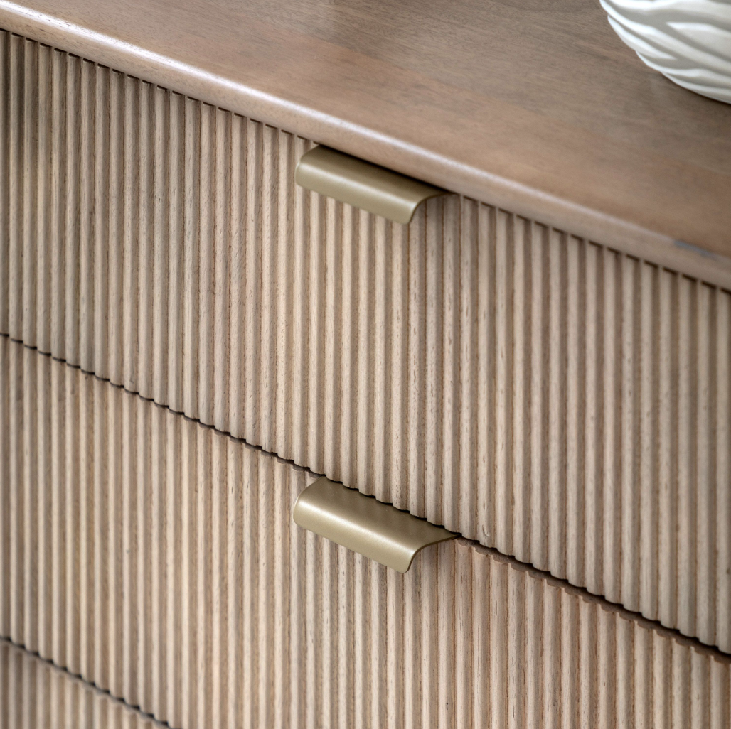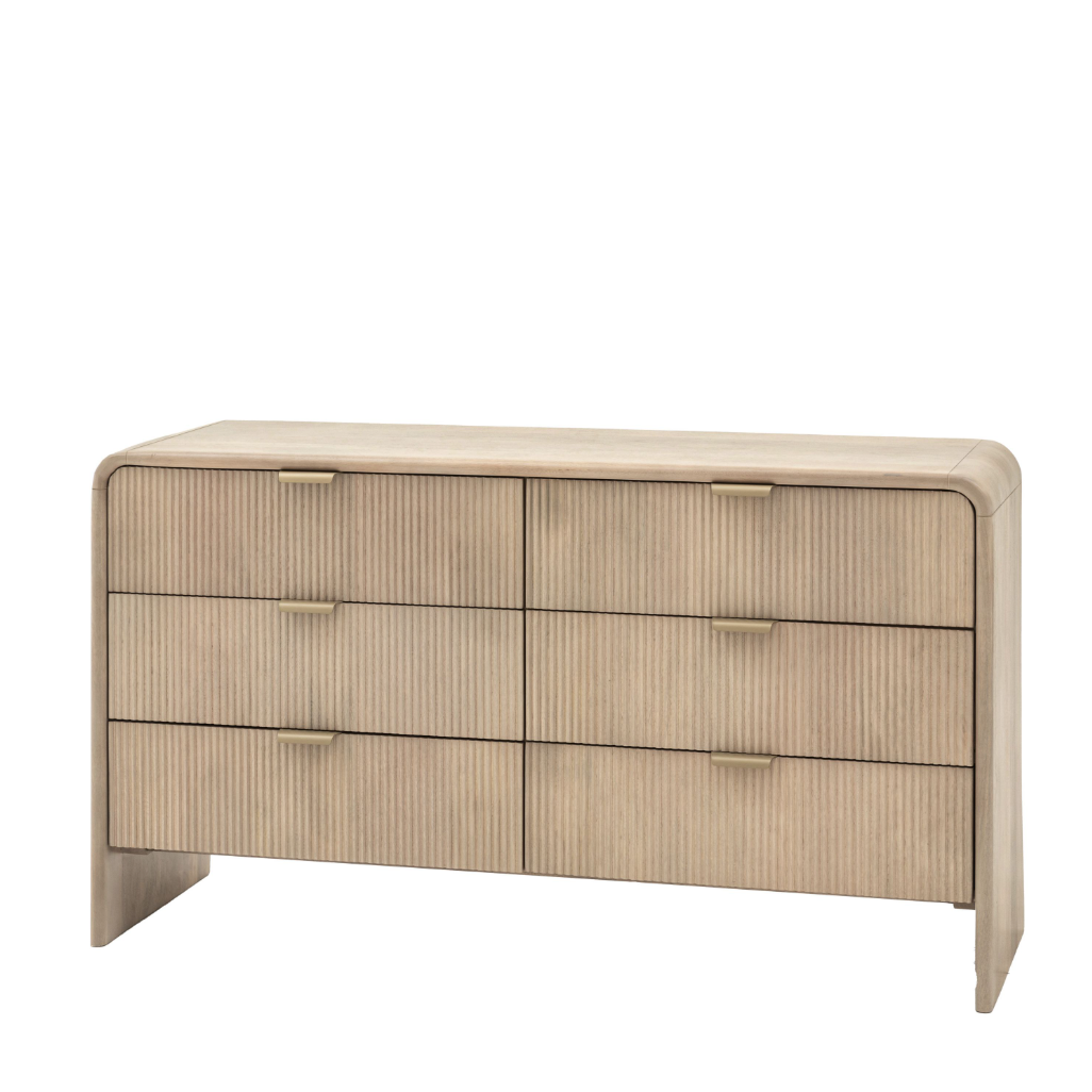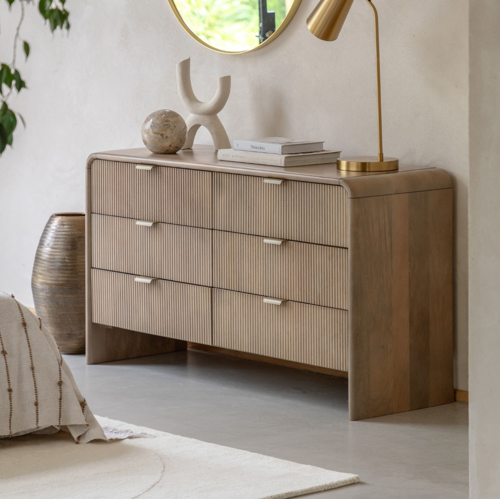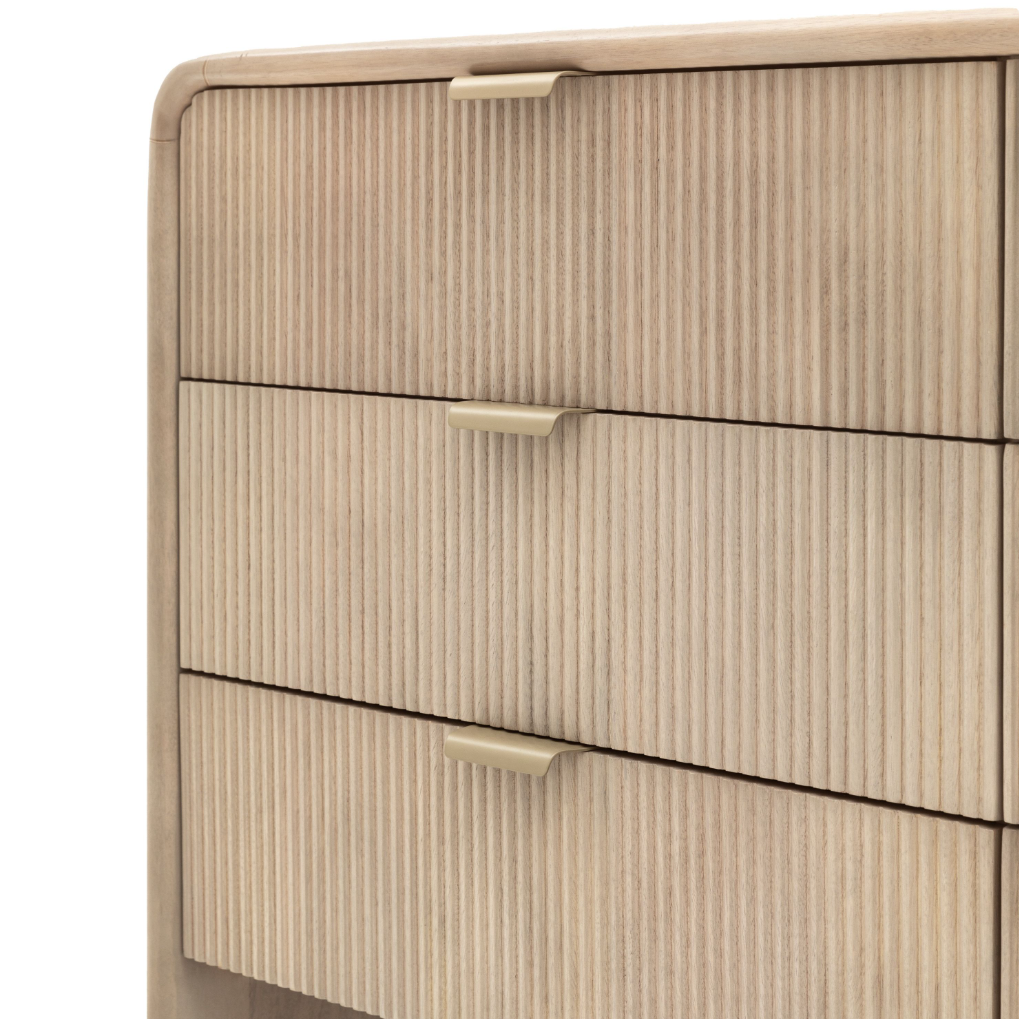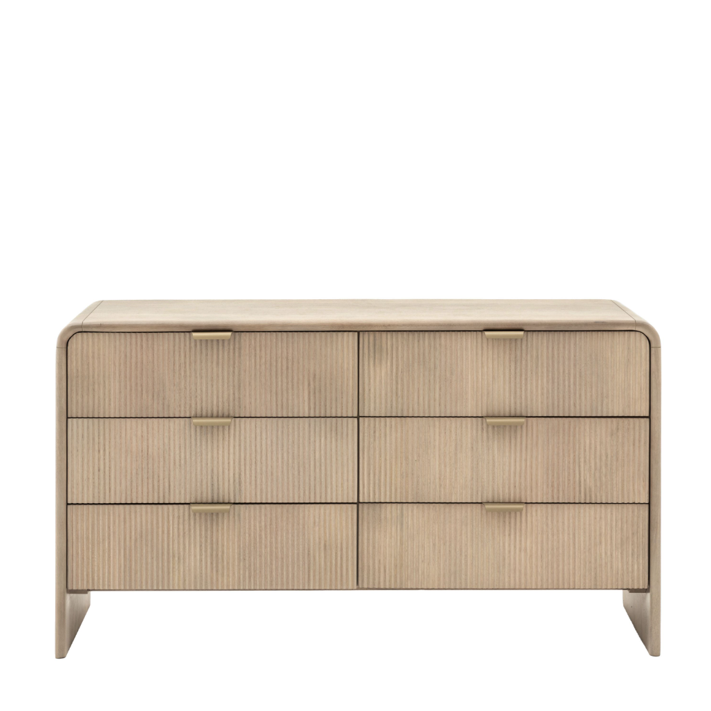 This 6 drawer chest offers a spacious and stylish storage solution. Designed with a curved top and fluted drawer fronts, this chest features six drawers, making it ideal for organising clothing, linens, or other items.