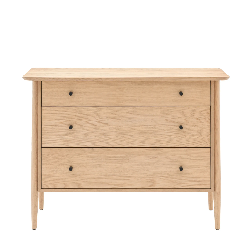 This stylish 3-drawer chest is crafted from high-quality oak, offering ample storage space for your belongings. Its clean lines and natural finish add a touch of Scandinavian style to any bedroom or living room.
