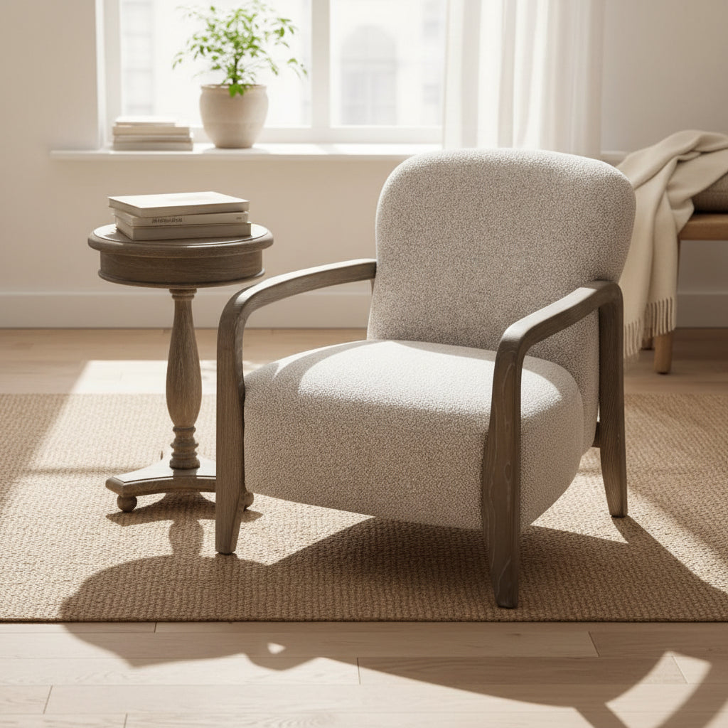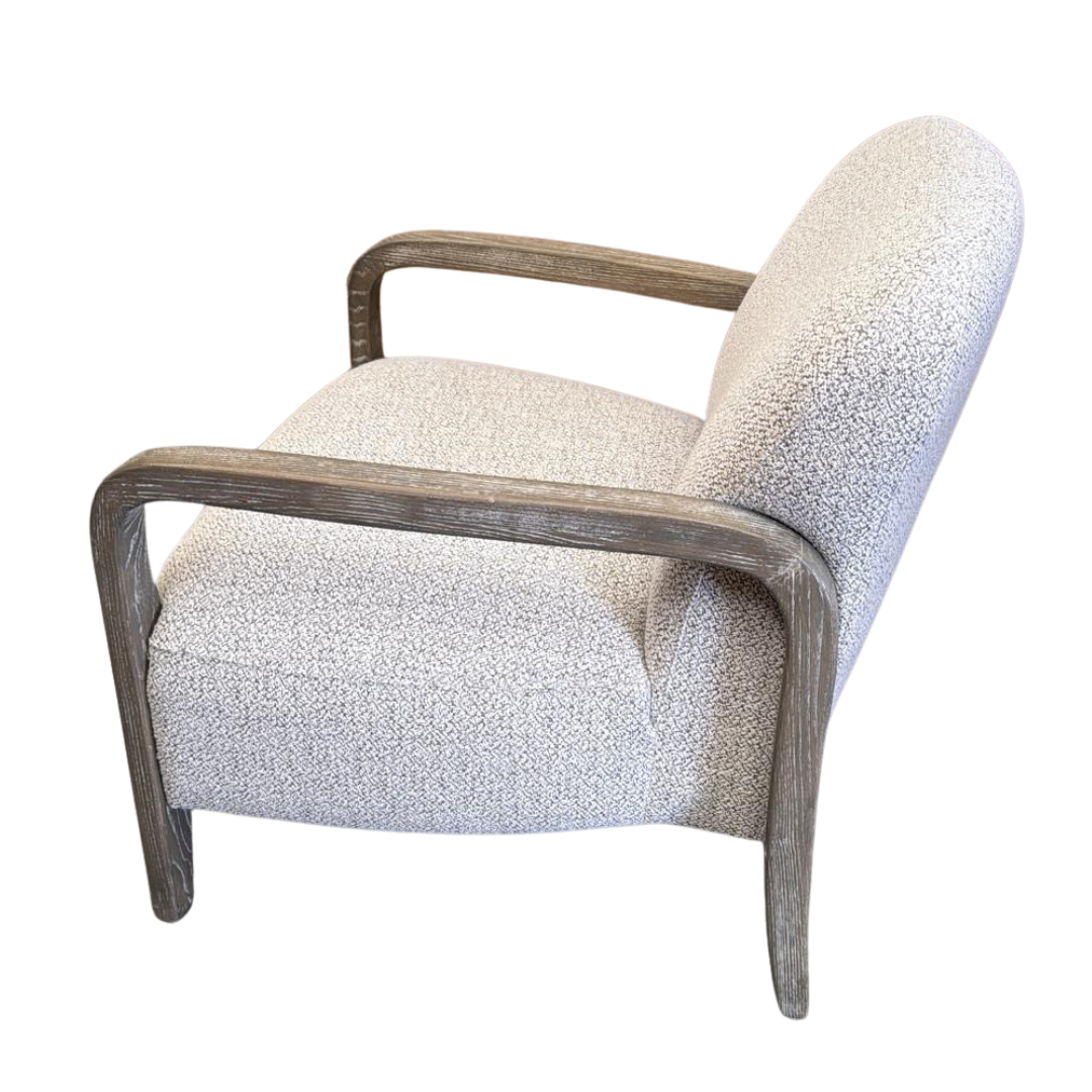 The gently rounded silhouette is paired with elegantly curved washed grey wood arms and legs, creating a warm contrast that blends mid-century inspiration with modern simplicity.