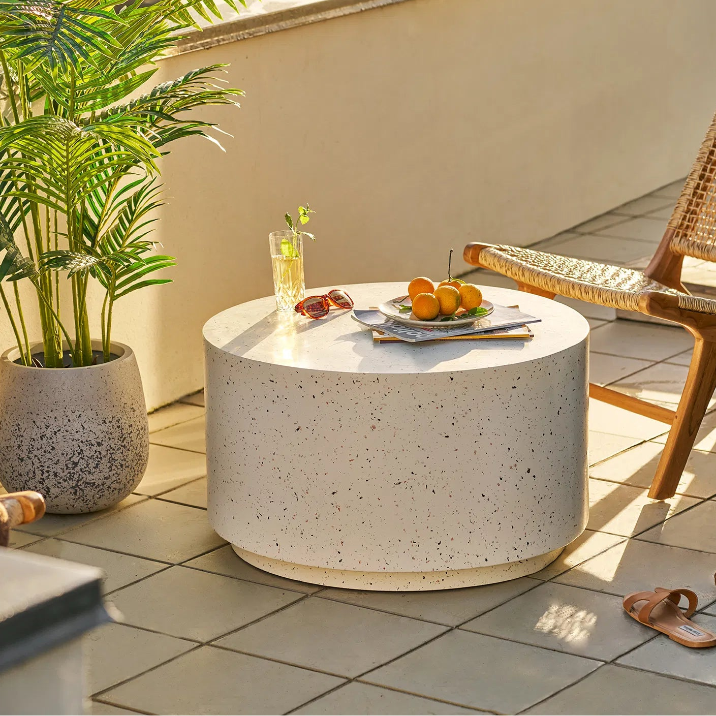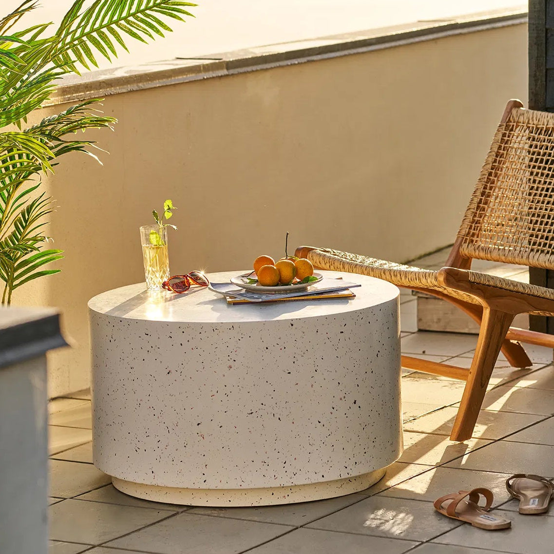 The Bliss Coffee Table is a bold yet understated centrepiece, defined by its clean cylindrical form and soft, neutral tone. Finished in a speckled stone-effect surface, it brings a calm, contemporary feel that works effortlessly in modern living spaces.