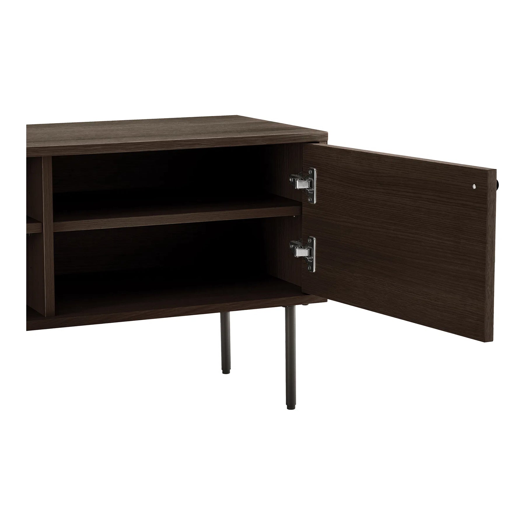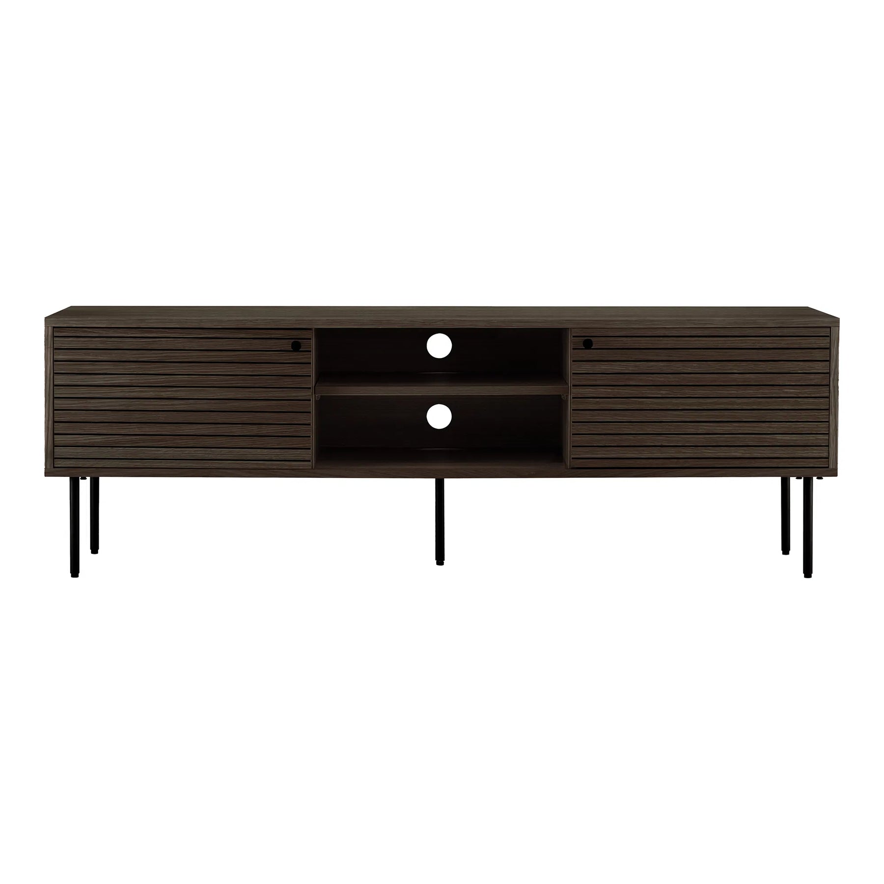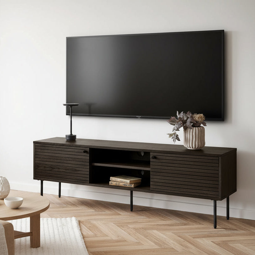 Elevate your entertainment space with the Elm TV Bench, a seamless blend of function and refinement. Crafted in rich, dark wood with horizontal slatted doors, The Elm introduces subtle texture and depth to your living room, while maintaining a sleek and modern silhouette. The minimalist black steel legs provide contrast and stability, complementing both contemporary and classic interiors.