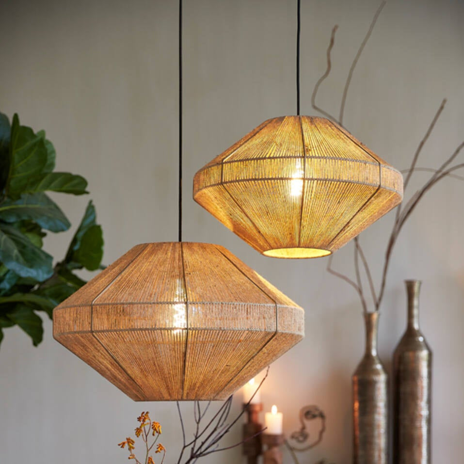 The Marylebone Jute Ceiling Pendant combines sculptural design with natural texture, creating a striking yet earthy focal point for your home. Handwoven with fine jute over a geometric metal frame, it casts a warm, ambient light that enhances dining and living spaces with effortless style.