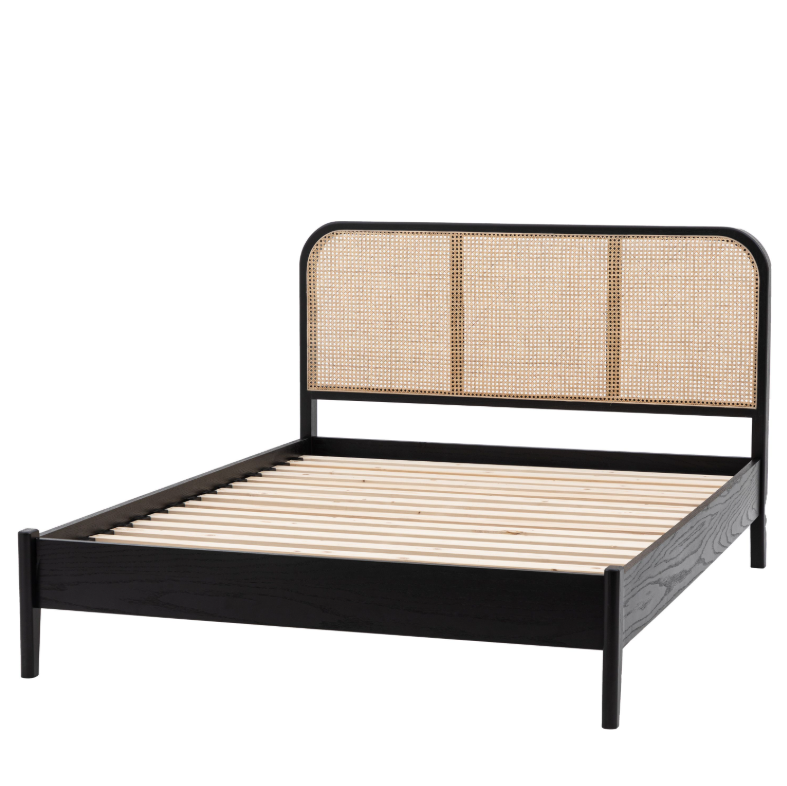 Dramatic statement style sure to become a modern classic. The solid black stand oak frame combines comfort and style ease, with curved corner headboard featuring a woven rattan panel creating a stunning stand out contrast of colours and materials. Available in 4'6" and 5" sizes. available in double and king